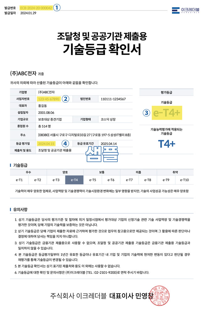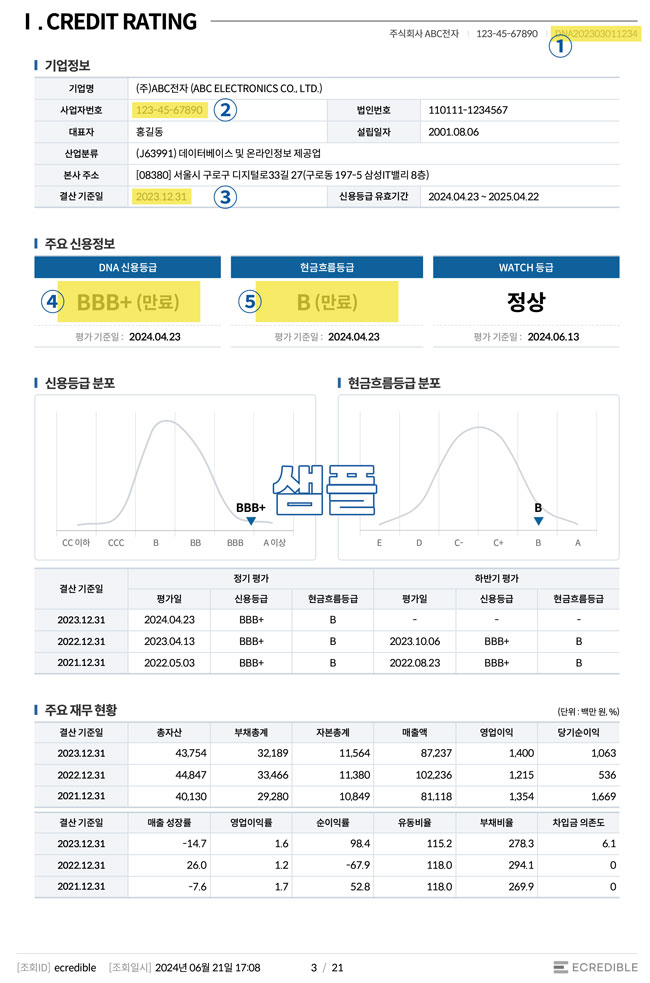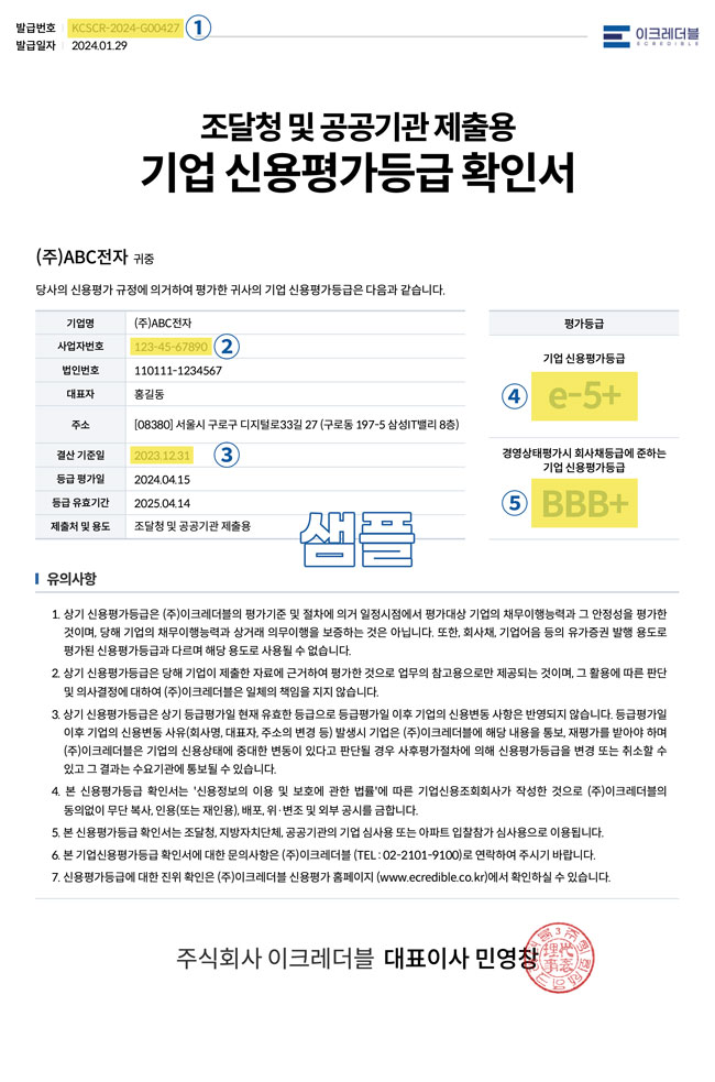 현재 페이지에서 등급의 진위 여부가 확인이 안되시거나 위조된 기업신용평가 보고서를 제공 받으셨을 경우는 당사 고객센터 : 02-2101-9100 로 연락주시기 바랍니다.